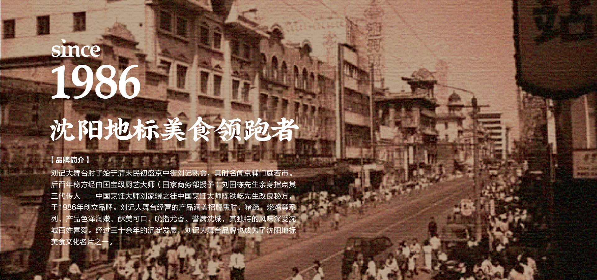 盛京,昔乃大清王朝發(fā)祥之地。劉記大舞臺(tái)肘子始于清末民初盛京中街劉記熟食,其時(shí)名聞京輔門(mén)庭若市。后百年秘方經(jīng)由國(guó)寶級(jí)廚藝大師(國(guó)家商務(wù)部授予)劉國(guó)棟先生親身指點(diǎn)其三代傳人——中國(guó)烹飪大師劉家驥之徒中國(guó)烹飪大師陳鐵屹先生改良秘方,于1986年創(chuàng)立品牌。劉記大舞臺(tái)經(jīng)營(yíng)的產(chǎn)品涵蓋招牌熏肘,豬蹄,燒雞等系列,產(chǎn)品色澤潤(rùn)嫩、酥美可口、吮指尤香、譽(yù)滿沈城,遂成古今絕味,其獨(dú)特的風(fēng)味深受沈城百姓喜愛(ài)。經(jīng)過(guò)三十余年的沉淀發(fā)展,劉記大舞臺(tái)品牌也成為了沈陽(yáng)地標(biāo)美食文化名片之一。